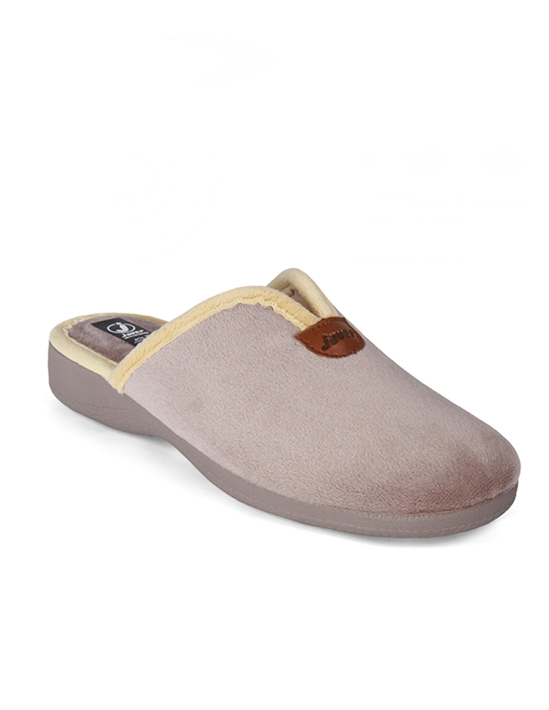 Zapatillas de casa abiertas en color niebla. Ancho especial con la suela vulcanizada 100% caucho natural. Fabricado en España con pelito suave para ofrecer una sensacion de confort y calidez.