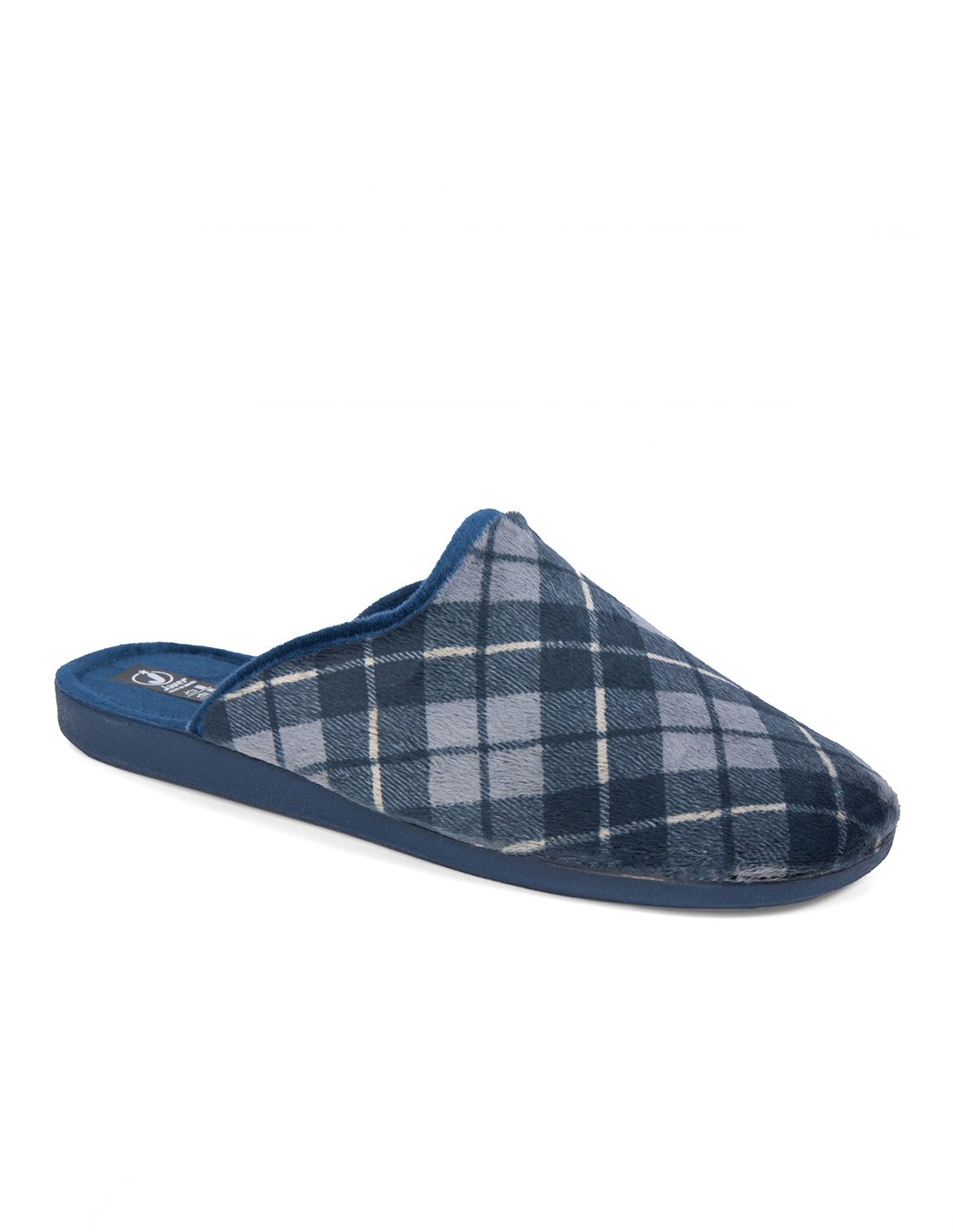 Zapatilla de casa en color azul marino con cuadros. Fabricado en España con la suela vulcanizada 100% caucho natural y pelito suave para ofrecer una sensacion de confort y calidez