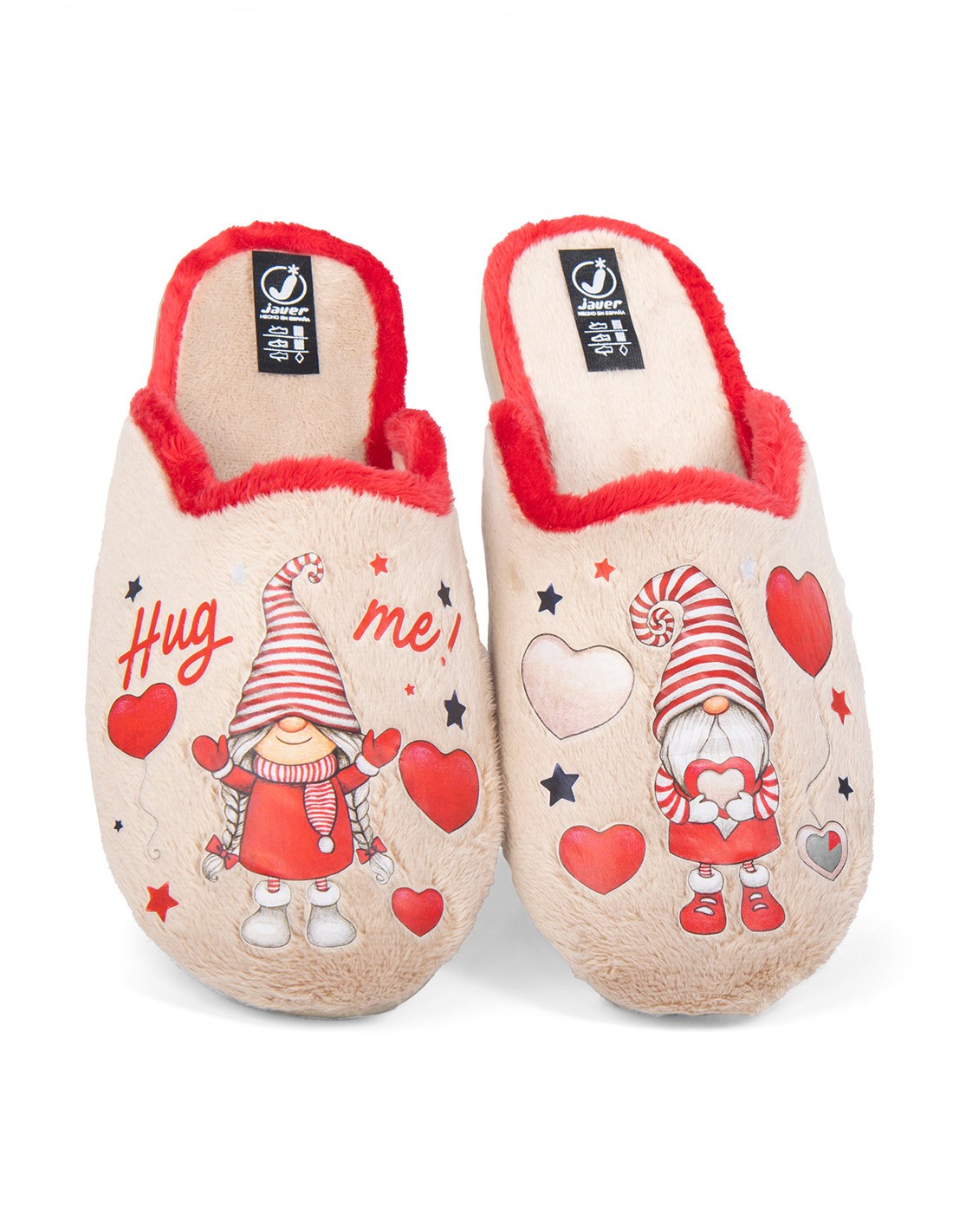 Zapatillas de casa abiertas en color beige con dibujo de Elfos. Fabricadas en España con la suela vulcanizada 100% caucho natural y pelito suave para ofrecer una sensacion de confort y calidez