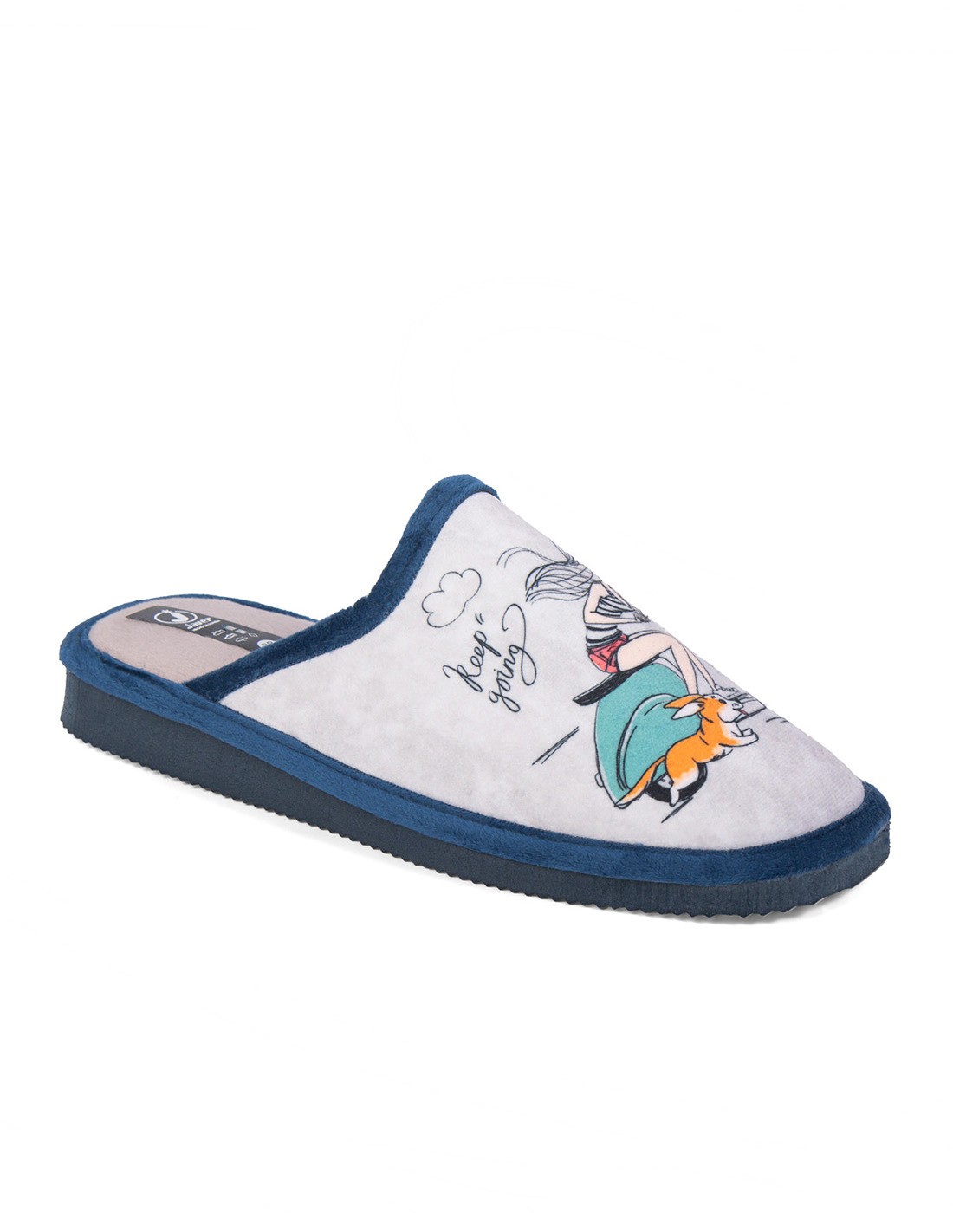 Zapatillas de casa abiertas en color marino con estampado de muñeca en moto. Fabricado en España con suela pegado eva microporoso y pelito suave para ofrecer una sensacion de confort.